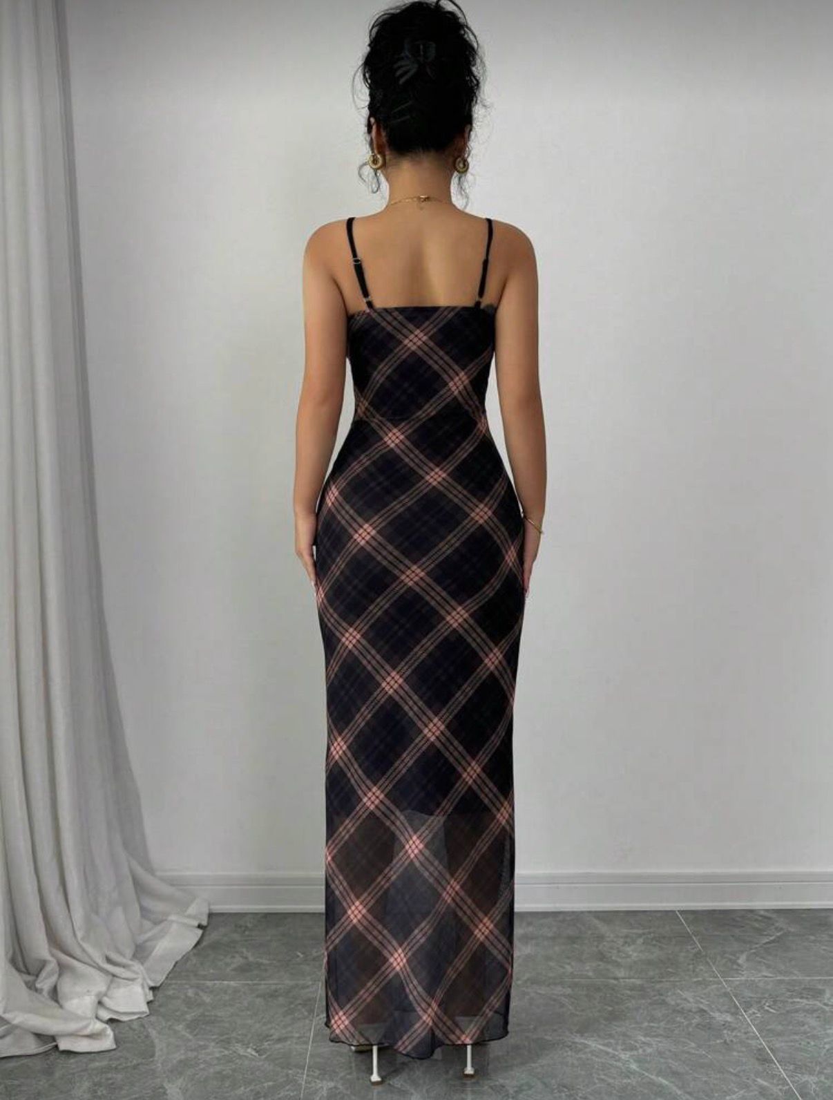 Elegant Mesh Plaid V-Neck Bodycon Dress Black